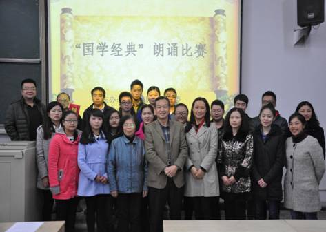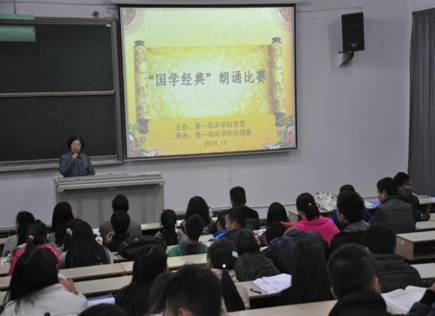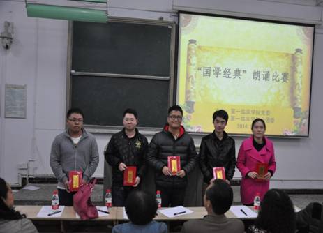 为进一步弘扬中华文化、传承“国学经典”、丰富大学生校园文化生活,第一临床学院于11月13日晚上7点在大连路校区第六阶梯教室举行了“国学经典”朗诵比赛。学院党委书记杨艳、副书记吴成玉、学生科科长蔡亮容、分团委书记陈俊、2011级辅导员和百余名学生参加了本次活动。原遵义市政协副主席、博士生导师钱民章教授,原遵医附院党委副书记、第一临床学院特聘关工委成员秦学文老师受邀担任评委。