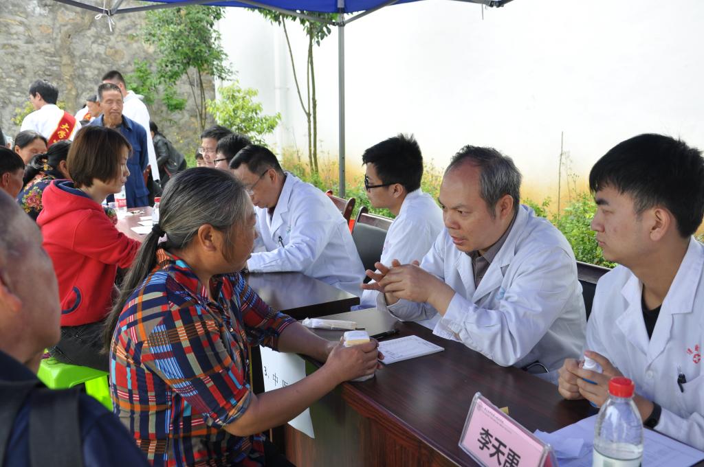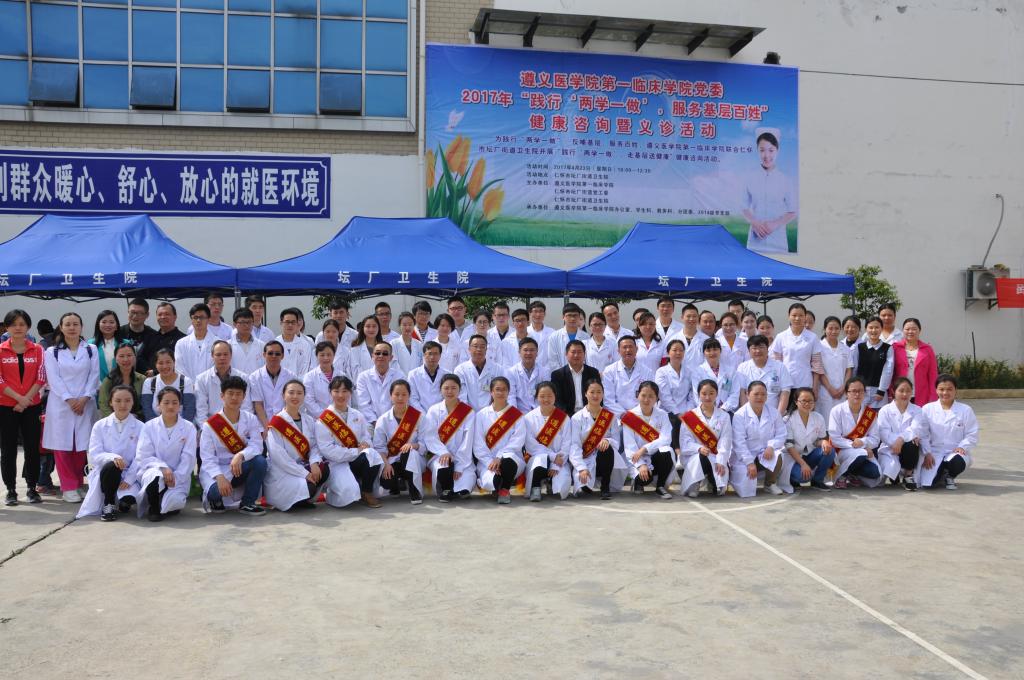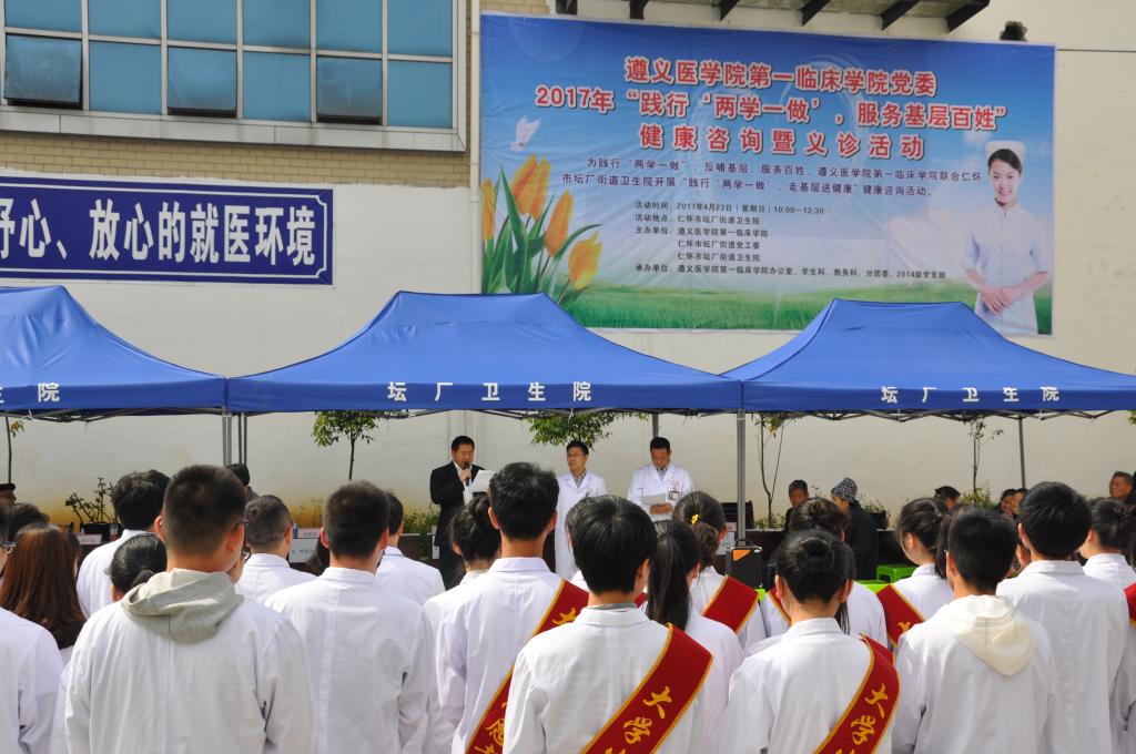 为反哺基层、服务百姓,365bet娱乐登录第一临床学院以践行“两学一做”为契机,于4月23日联合仁怀市坛厂卫生服务中心开展“践行‘两学一做’,走基层送健康”健康咨询活动。在第一临床学院常务副院长、神经内科主任徐平教授带队下,中医科吴宗德、李天禹主任、呼吸内科赵勇、欧阳瑶主任、内分泌科杨孟雪主任、心血管内科陈剑玲主任、泌尿外科赵泽驹主任等共13名专家和临床学院全体教职工及43名学生志愿者共计80余人参加了此次活动。