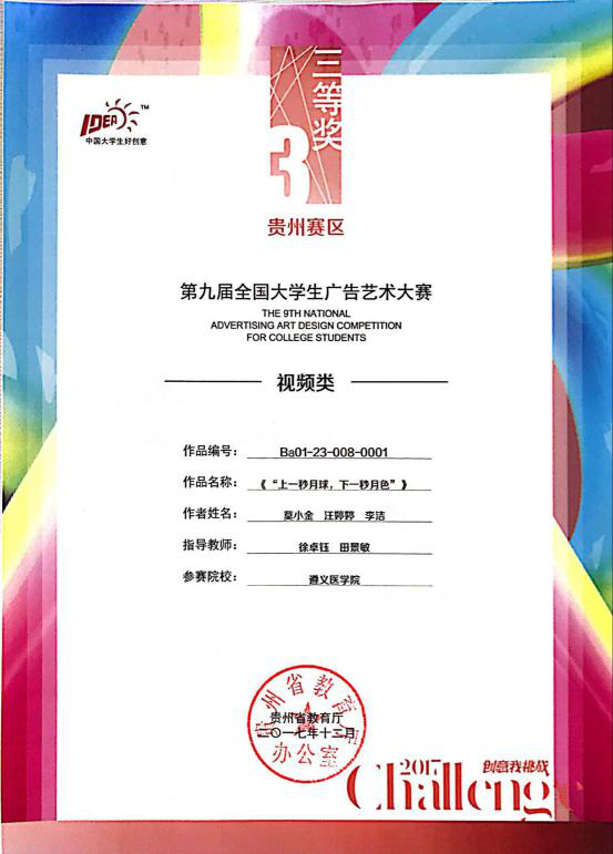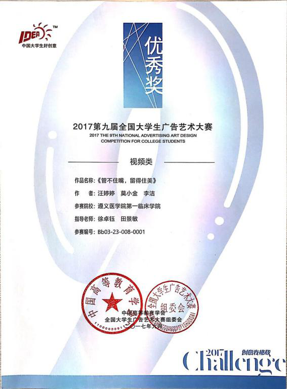 由教育部高等教育司指导,中国高等教育学会、教育部高等学校新闻传播学类专业教学指导委员会共同主办的“第九届全国大学生广告艺术大赛”(以下简称大广赛)落下帷幕。第一临床学院汪婷婷同学报送2件作品参赛,其中《管不住嘴,留得住美》荣获全国赛区优秀奖、贵州赛区二等奖,《上一秒月球,下一秒月色》荣获贵州赛区三等奖。