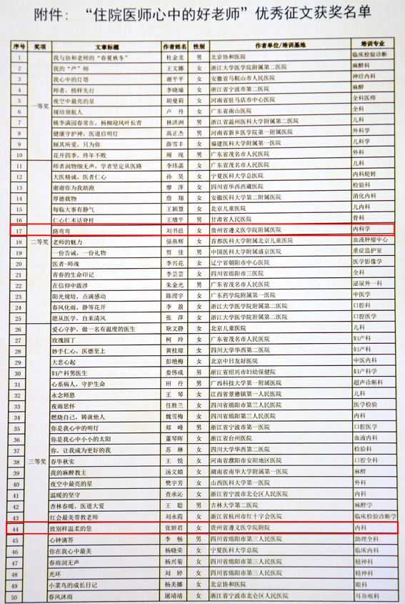 此外,中国医师协会联合《健康报》、《医师报》于2015年7月在全国展开了“住院医师心中好老师”推选和征文活动,我院2013级内科规培学员刘书邑、2014级内科规培学员张妍君分别获得征文比赛的二等奖、三等奖。此次征文活动由中华医师协会组织专家从全国207篇文章中评选出50篇优秀文章。贵州省仅我院参赛学员获奖。