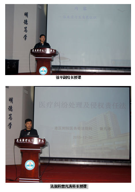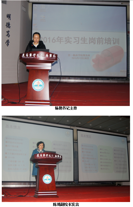 为帮助实习同学尽快适应临床工作、融入新的环境,了解、掌握实习期间各项规章制度,第一临床学院于2015年12月30-31日在遵医附院第二住院楼四楼多功能厅提前进行了2016年实习生岗前培训活动。附属医院分管教学副院长陈琦教授、第一临床学院常务副院长徐平教授、党委杨艳书记、吴成玉副书记、学生科、教务科工作人员以及各教研室主任、副主任、秘书等参加了此次岗前培训。