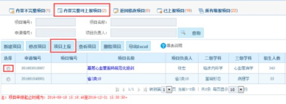 (四)信息填写完整后,项目自动转入到“内容完整可上报项目”列表中,选择项目,点击【项目上报】按钮,报本单位继教管理人员审核。