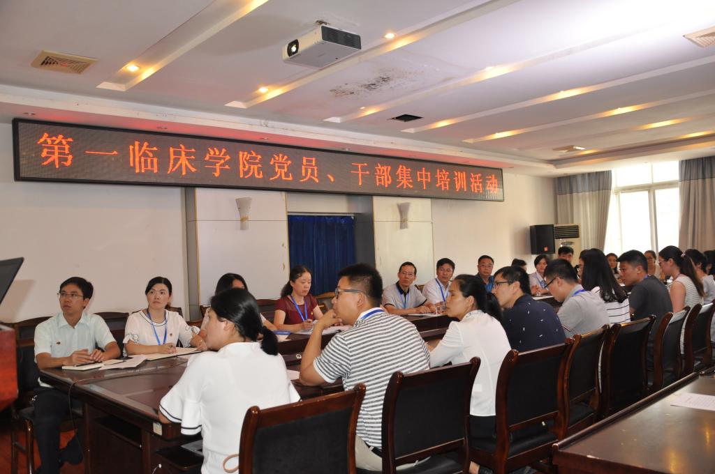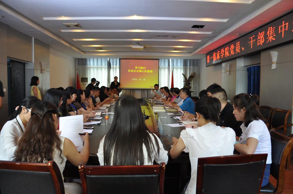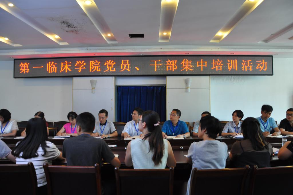 为开展“两学一做”工作常态化制度化,深入贯彻全面从严治党要求,进一步落实中央八项规定精神及省委十项规定,第一临床学院党委于8月23日在大连路五楼会议室开展党员干部集中培训学习。临床学院党委副书记杜娟、常务副院长徐平、临床技能中心主任、临床学院副院长吴宗德以及全体党员干部参加培训学习,培训活动由杜娟副书记主讲。